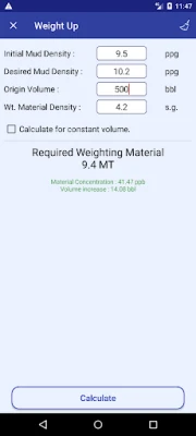 This App is a mud calculator. Daily mud calculations and formulas are placed into it. this App is designed with a clear and sharp view to make it easy to use. The app is compatible for smartphones and tablets and supporting portrait and landscape screens. It's a handy tools for any drilling fluid engineers in oilfield. This software is also included a unit converter. The app is calculating for: