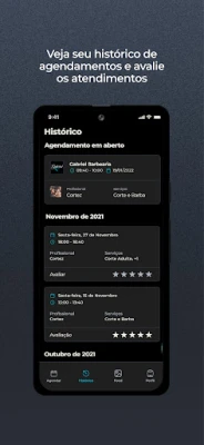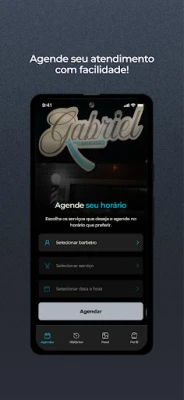 Através do App Gabriel Barbearia_ os clientes podem realizar seus agendamentos de uma forma muito mais prática. Na tela inicial, é possível selecionar os serviços e horário desejado para seu próximo atendimento. Já na tela de histórico, você poderá confirmar ou cancelar seus agendamentos. É possível também na tela do perfil o cliente editar suas informações, como e-mail, foto de perfil e telefone.