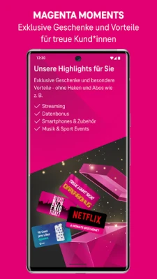 Als Kund*in profitieren Sie von unserem exklusiven Treueprogramm! Mit Magenta Moments erwarten Sie regelmäßig besondere Geschenke, Vorteile und Überraschungen. Ob Mobilfunk, Streaming oder Shopping - wir danken Ihnen für Ihre Treue.