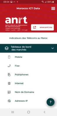 Designed by the Moroccan National Telecommunication Regulatory Agency (ANRT), Morocco ICT Data allows access to many indicators on information and communication technologies in Morocco. Indicators cover many segments such as mobile and fixed telephony, Internet, payphones, domain names and IP addresses; and give an accurate idea about subscribers’ accounts, penetration rate, markets shares, traffic, revenues, usages and telecom infrastructures in Morocco. Some indicators show the evolution of the sector since 2004.