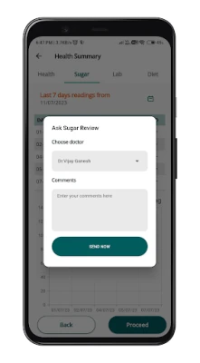 6) Record sugar values - the user can record their self monitored blood sugar values and once a while get it reviewed by their doctor