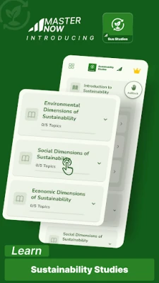 Explore the principles of Sustainability Studies with this comprehensive learning app designed for students, environmentalists, and sustainability advocates. Whether you're studying renewable energy, resource management, or sustainable development, this app offers clear explanations, practical examples, and interactive exercises to expand your knowledge of building a sustainable future.